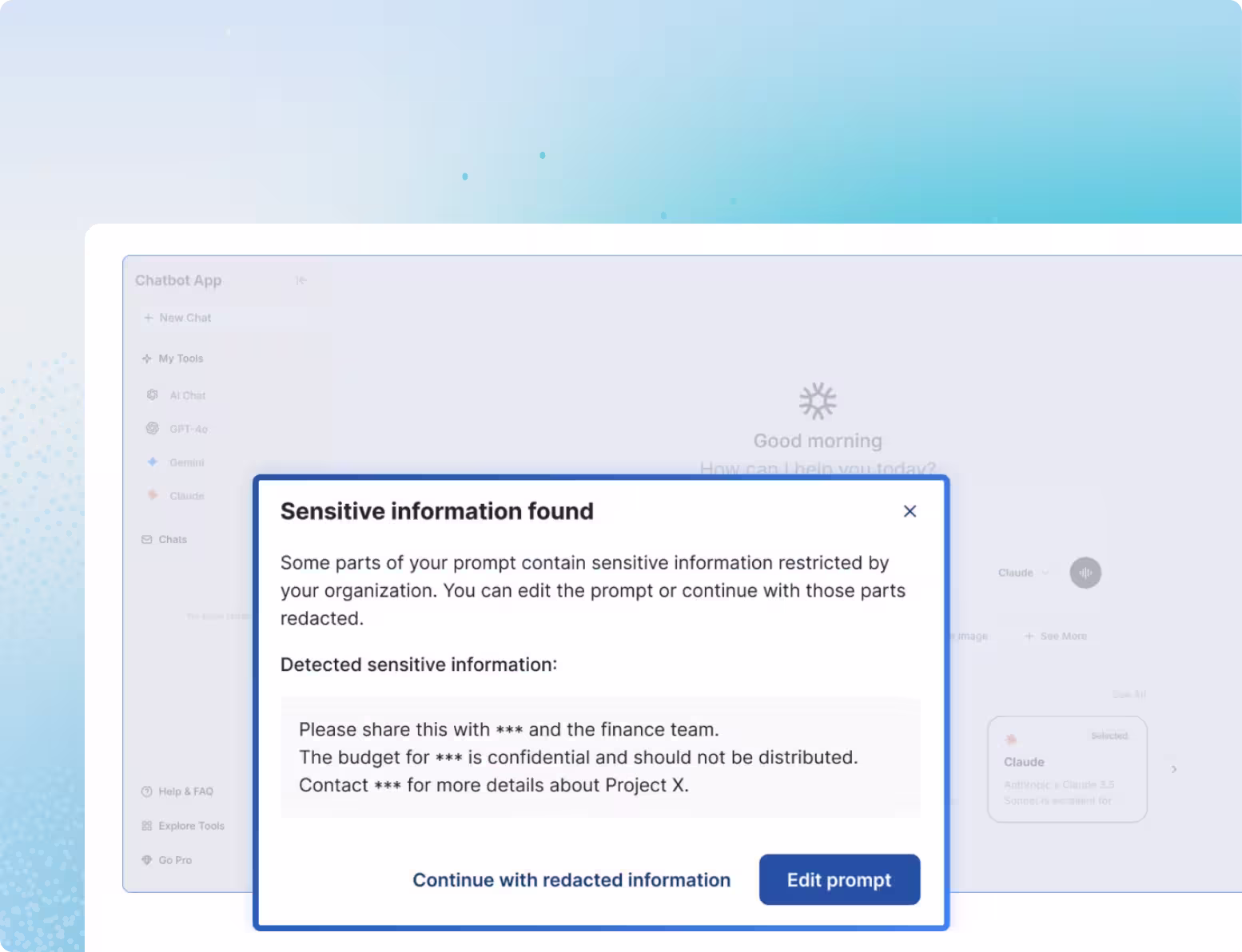 Prevent proprietary data from being uploaded to unnoticed and personal use third-party Gen AI platforms like ChatGPT and Claude by catching and blocking sensitive prompts at the source, before they ever leave the browser.