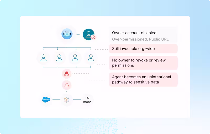 Obsidian flags orphaned agents with persistent access, public URLs that expose agents, unapproved external services, unsanctioned MCP connections, silent model swaps, and shared credentials with broad OAuth scopes. Risk is scored based on toxic combinations, not just individual misconfigurations.