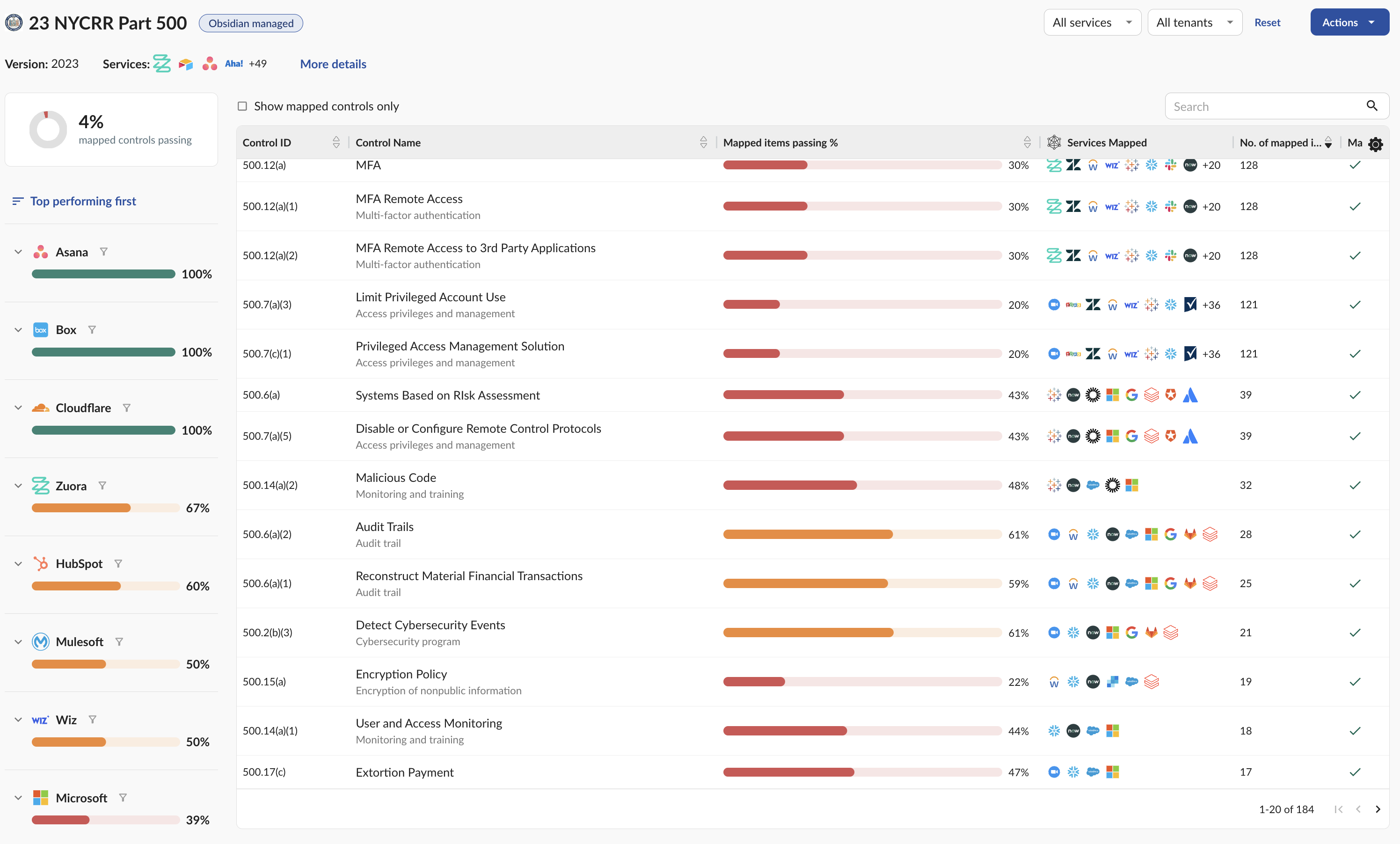 - Automate Compliance Tracking and Reporting: Map NYDFS controls to all SaaS in Obsidian to identify gaps, benchmark progress, and simplify remediation for app owners.