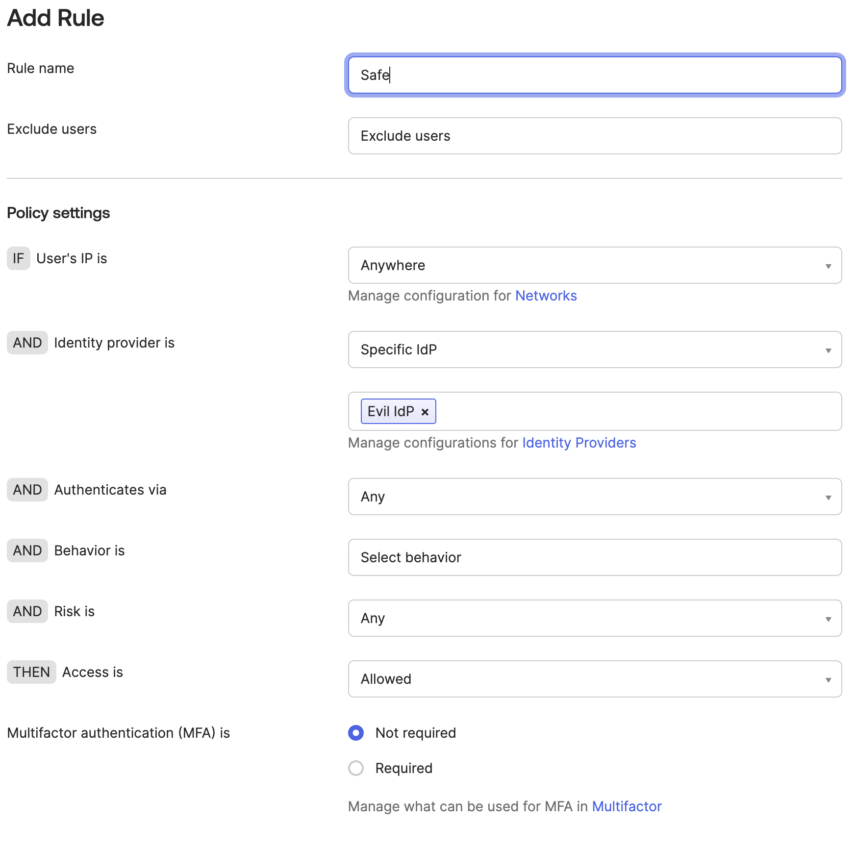 Alter sign-on policies. Depending on the configuration, the current sign-on policies may continue to request Multi-Factor Authentication (MFA) even when authenticating from an inbound IdP. If MFA is reset during an Incident Response (IR) remediation or the attacker has never registered MFA for the target account, they could be locked out. To address this, we can implement a new rule that allows us to bypass MFA or modify existing rules to ensure authentication follows the default sign-on rule.