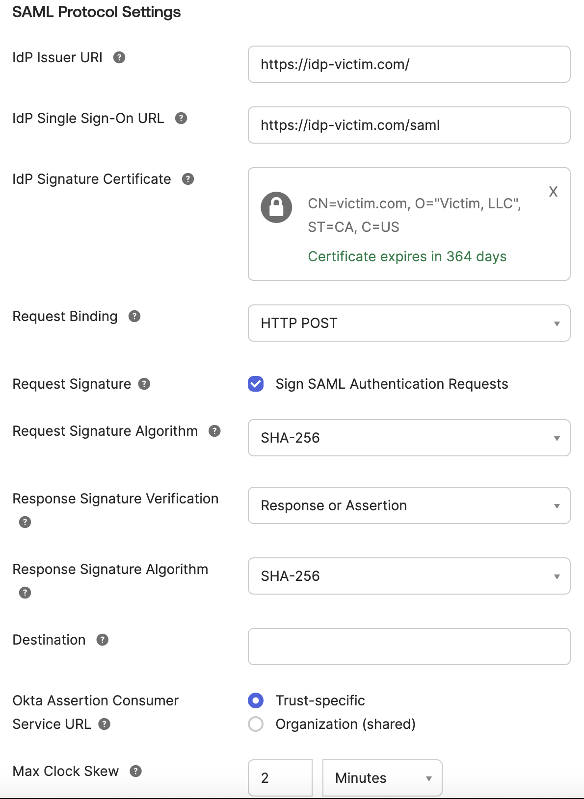 Let’s assume the compromised user’s email address is the name from an inbound IdP. We’ll employ the user@victim.com for both the attacker and victim accounts. Our primary objective is to instruct Okta to link the IdP username to idpuser.userPrincipalName and align it with the Okta Username. This is possible because attackers can generate arbitrary identity assertions through a fully controlled and trusted inbound IdP: