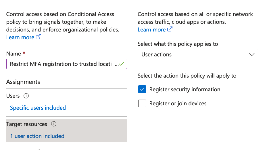 - Name the policy something like “Restrict MFA registration to trusted locations only”