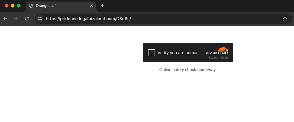 Before displaying the phishing page, a custom page with a Cloudflare turnstile is shown to verify that the user is, in fact, human. These turnstiles make it harder for email protection systems, like URL scanners, to detect phishing sites.