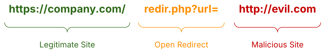 An attacker uses a trusted domain (company.com) to redirect users to a malicious site (evil.com). These redirects make it difficult for traditional phishing solutions to block the attack since legitimate domains are involved.