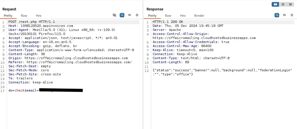 - Once the user provides their email (either manually or auto-filled), the phishing page communicates with the command-and-control (C2) server to validate the email by sending a POST request. If the email is valid, the process continues.