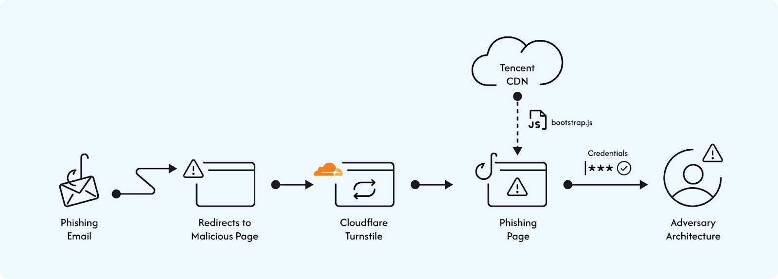 - After clearing the turnstile, various JavaScript libraries are loaded, and the phishing page is built by a bootstrap.min.js file hosted on Tencent Cloud’s CDN.