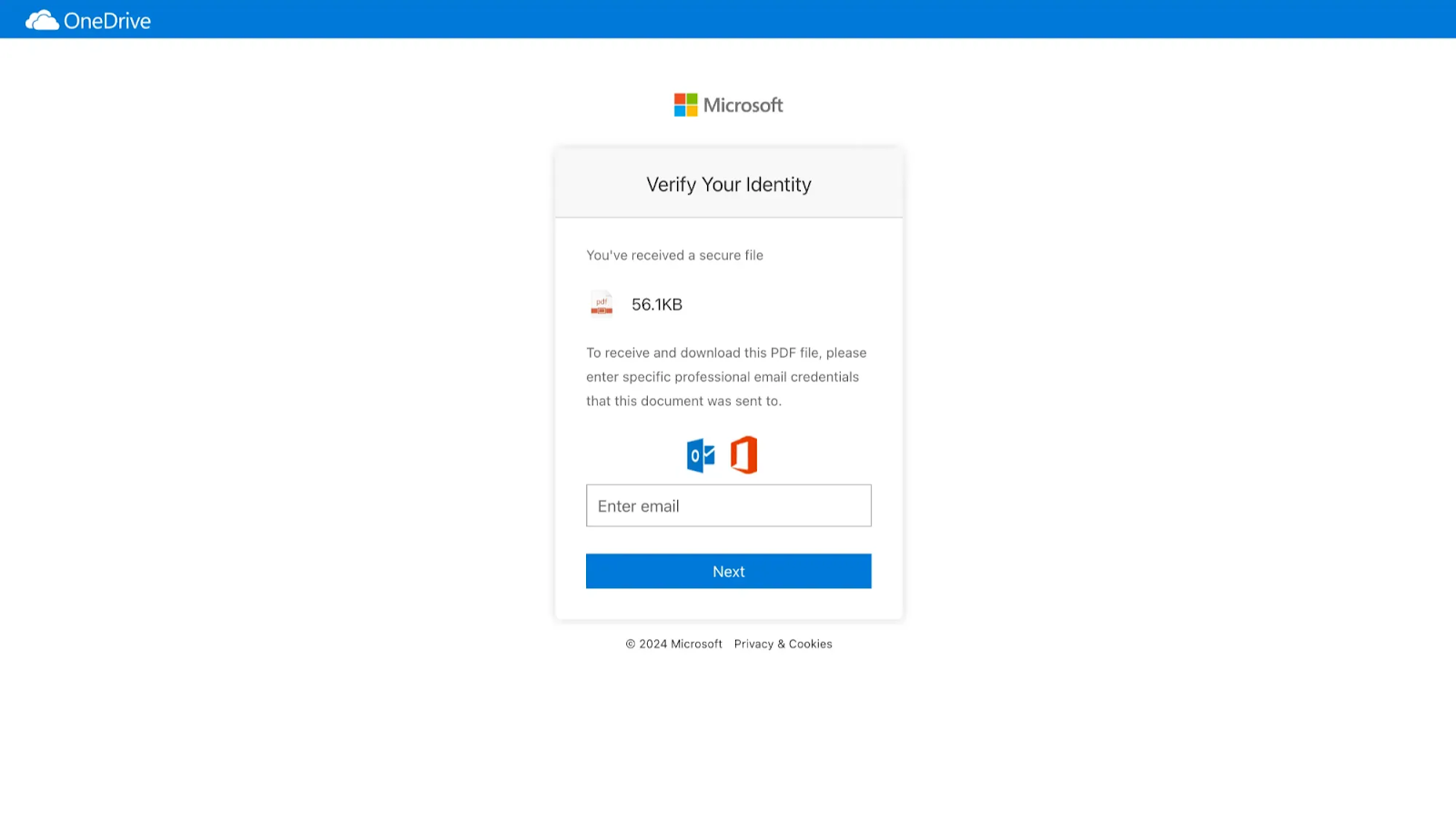 The second template appears to be a targeted service phishing page. In this example, we see a OneDrive templated phishing page. This template is newer to the scene:
