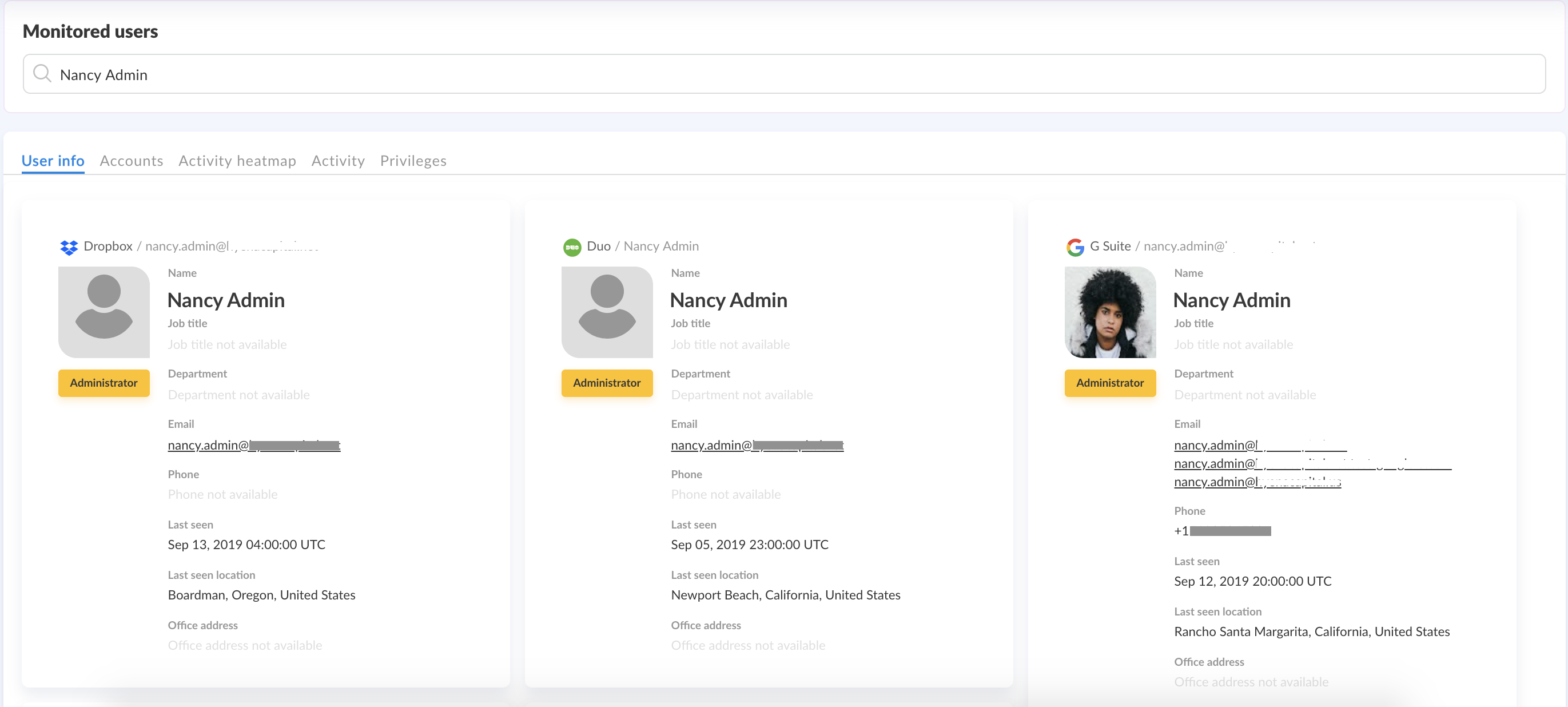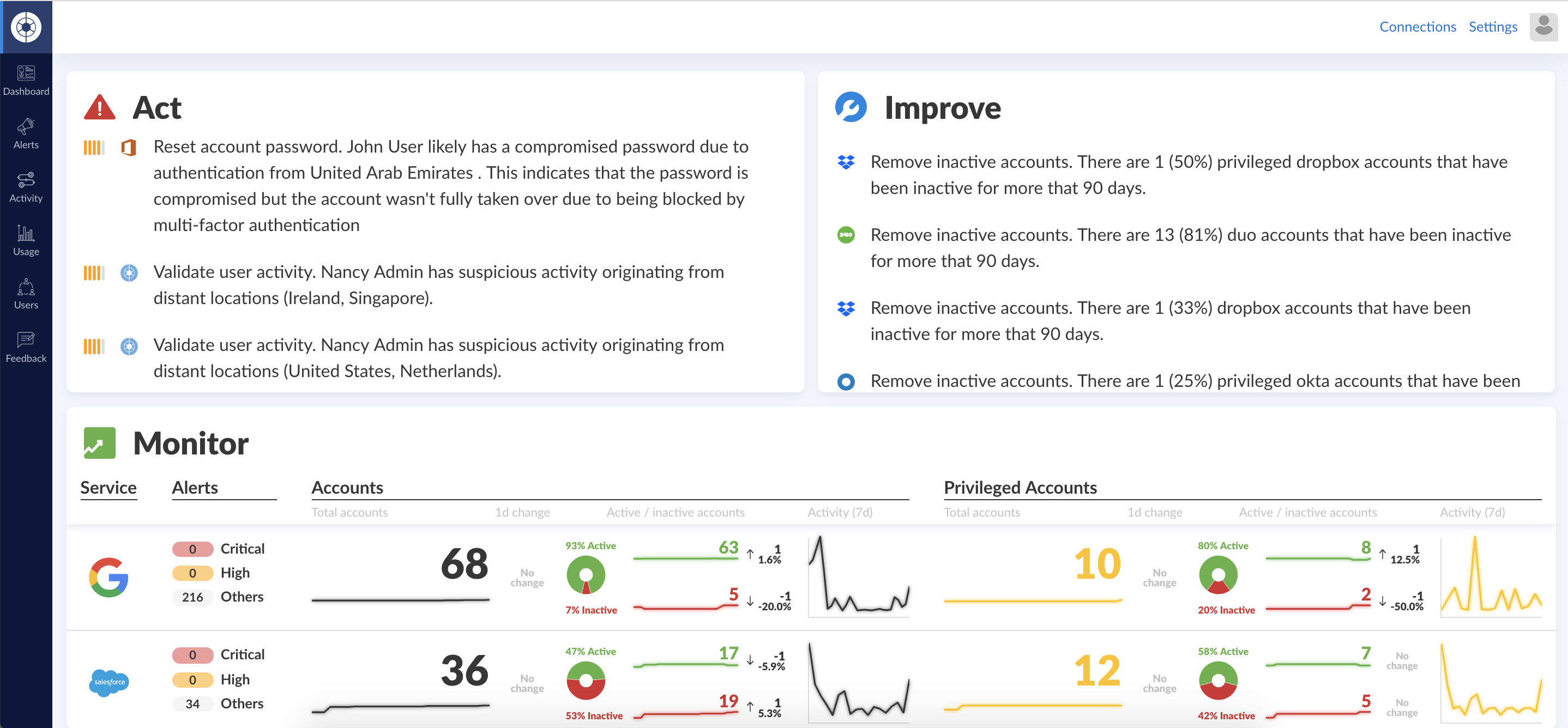 - Full visibility into user accounts, access, and privileges in the cloud services