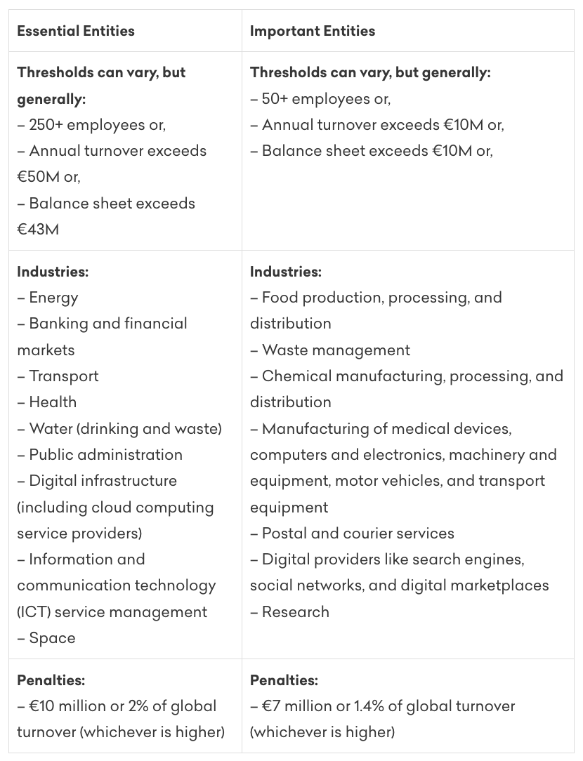 NIS2 applies to public and private sector entities that provide critical services or infrastructure within the EU. The updated directive now defines two new classifications, “Essential Entities” and “Important Entities,” each with modified cybersecurity obligations. Entities must adhere to controls related to risk management, reporting of cyber incidents, and information sharing. Covered entities will need to implement new processes and policies to comply by October 2024.