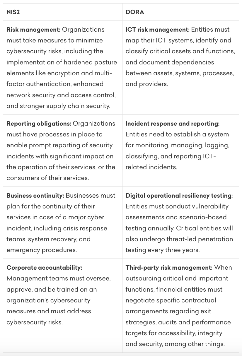 Similar to NIS2, DORA introduces strict guidelines for incident reporting, resilience testing, third-party risk, and risk management. DORA also directs entities to have threat detection mechanisms in place for ICT network performance issues and ICT-related incidents, and to identify potential material single points of failure.
