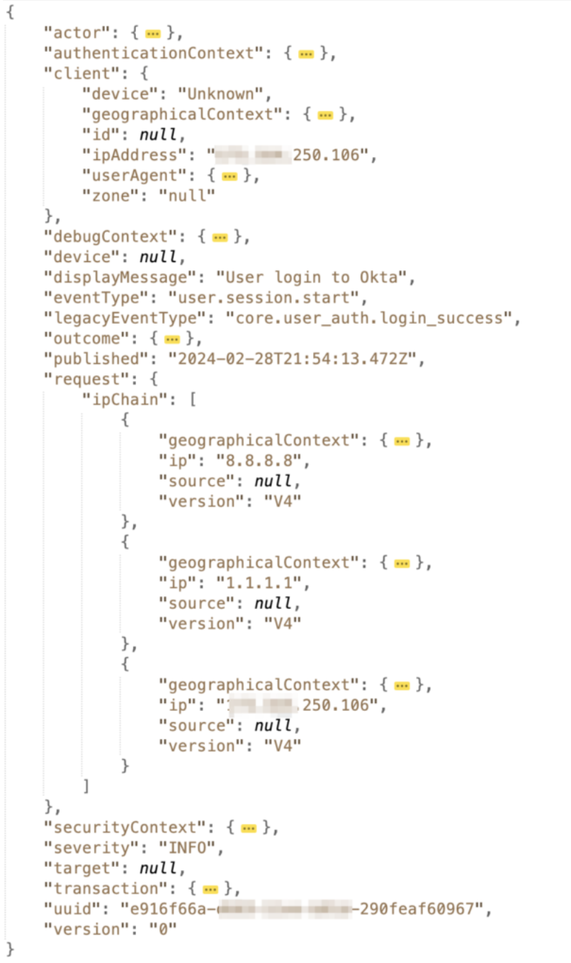 In the Okta audit log, two fields are relevant to the client’s IP information: the client.ipAddress field and the request.ipChain field. The ipChain is an array of IP and IPGeo information, while the ipAddress is a single IP corresponding to one of the IPs in the ipChain.