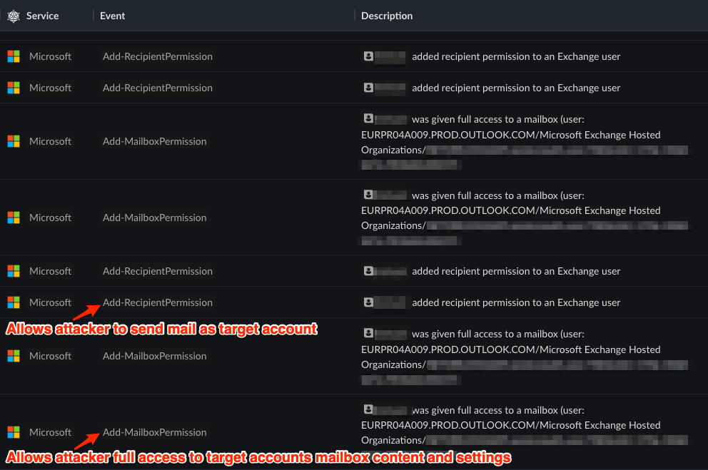Below is a timeline of events from a Microsoft tenant where the attacker was able to add themselves full access to a target user’s mailbox content and the ability to send mail as that target account.