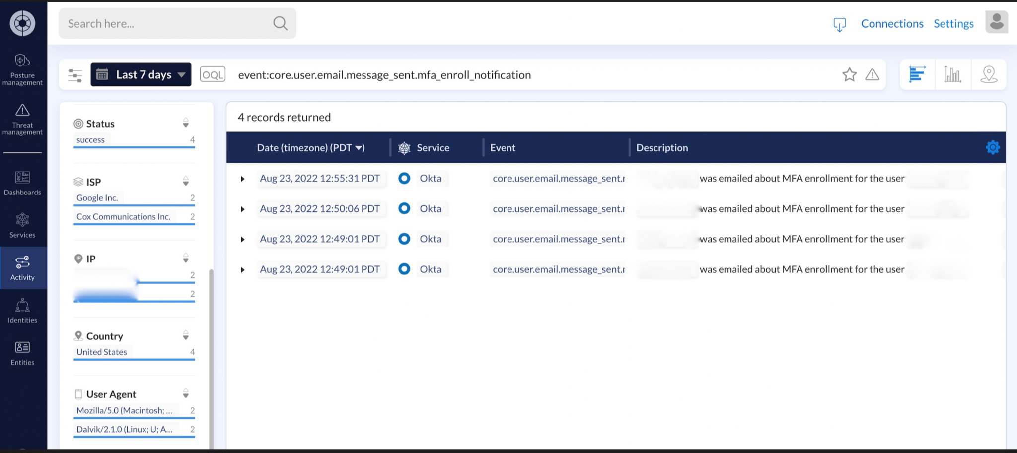 While not inherently malicious behavior on its own, the registration of a new device for MFA allowed our customer to begin investigating potentially compromised user accounts. Within minutes, Obsidian’s custom detection capabilities were leveraged to trigger anytime new MFA devices were successfully enrolled in Okta which signaled the successful enrollment of a new device for MFA. This enabled the swift identification of employees who may have fallen victim to the SMS phishing attack. With a cohort of potentially compromised users easily identified, they focused their time on investigating each individual from within the Obsidian portal.