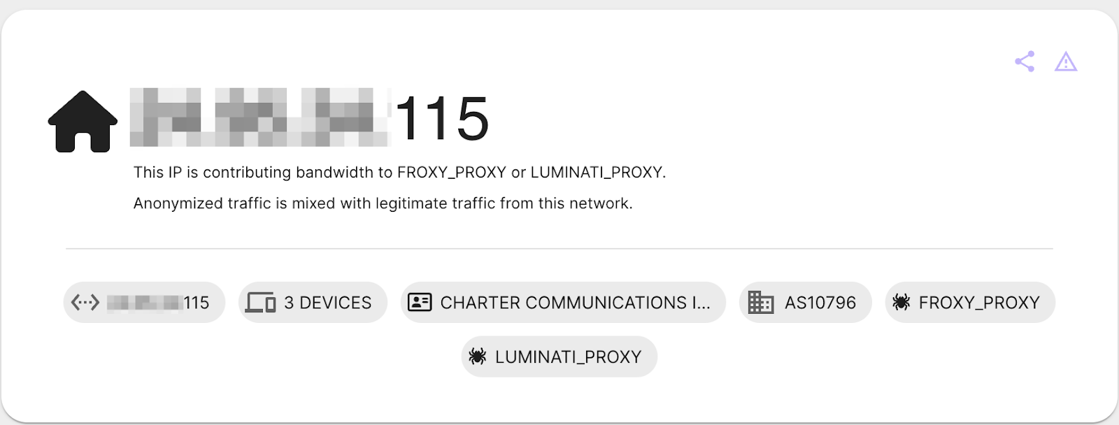 Unlike VPNs that use IPs assigned to infrastructure like AWS or GCP, residential proxies leverage IPs assigned to real individuals through Internet providers. Users worldwide can lend their bandwidth and IP to any proxy provider. The dynamic nature of residential IPs makes them more challenging to identify compared to VPNs. To learn more, read Sekoia’s blog post that offers further insight on residential proxies.