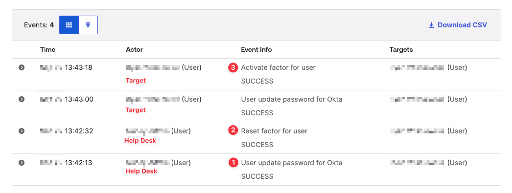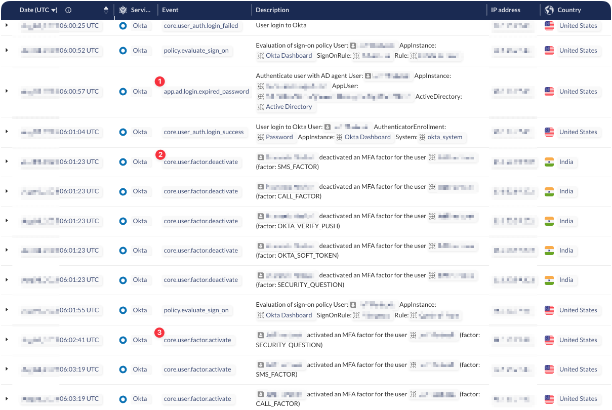 If you pull Okta logs into Obsidian Security, you’re able to see the attack in this way: