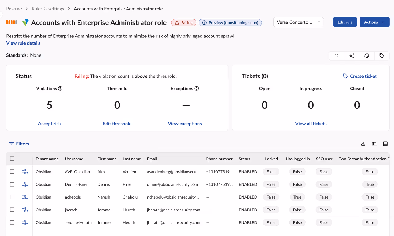 Versa Concerto empowers cloud access and visibility, but also introduces risks from excessive access and third-party code. Obsidian’s SaaS-native security stack continuously monitors token usage, enforces secure configurations, and delivers identity-aware detection to help organizations mitigate modern SaaS threats.